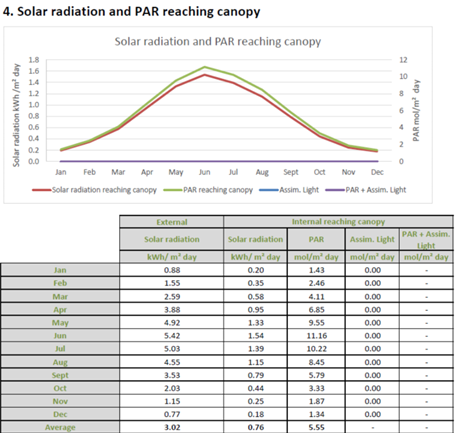 Outputs: User designs a grid in the greenhouse. Software calculates solar radiation reaching canopy at any locating of the defined grid for a specific height. Output is an Excel file with hourly of solar radiation / PAR in each point of the grid.