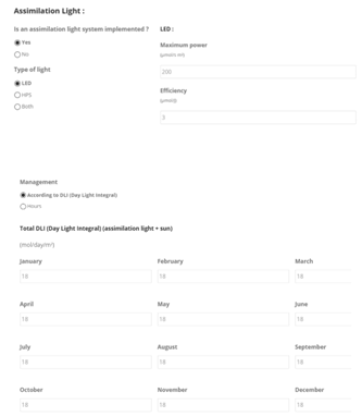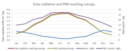 Hortinergy simulates on an hourly basis the solar radiation reaching canopy and the additional assimilation lighting required to reach the DLI.