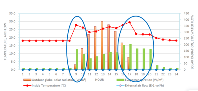 The example below shows the crop transpiration and a higher inner temperature when HPS assimilation lighting is switched on from to 9 to 11 AM and 4 to 9 PM to reach DLI.